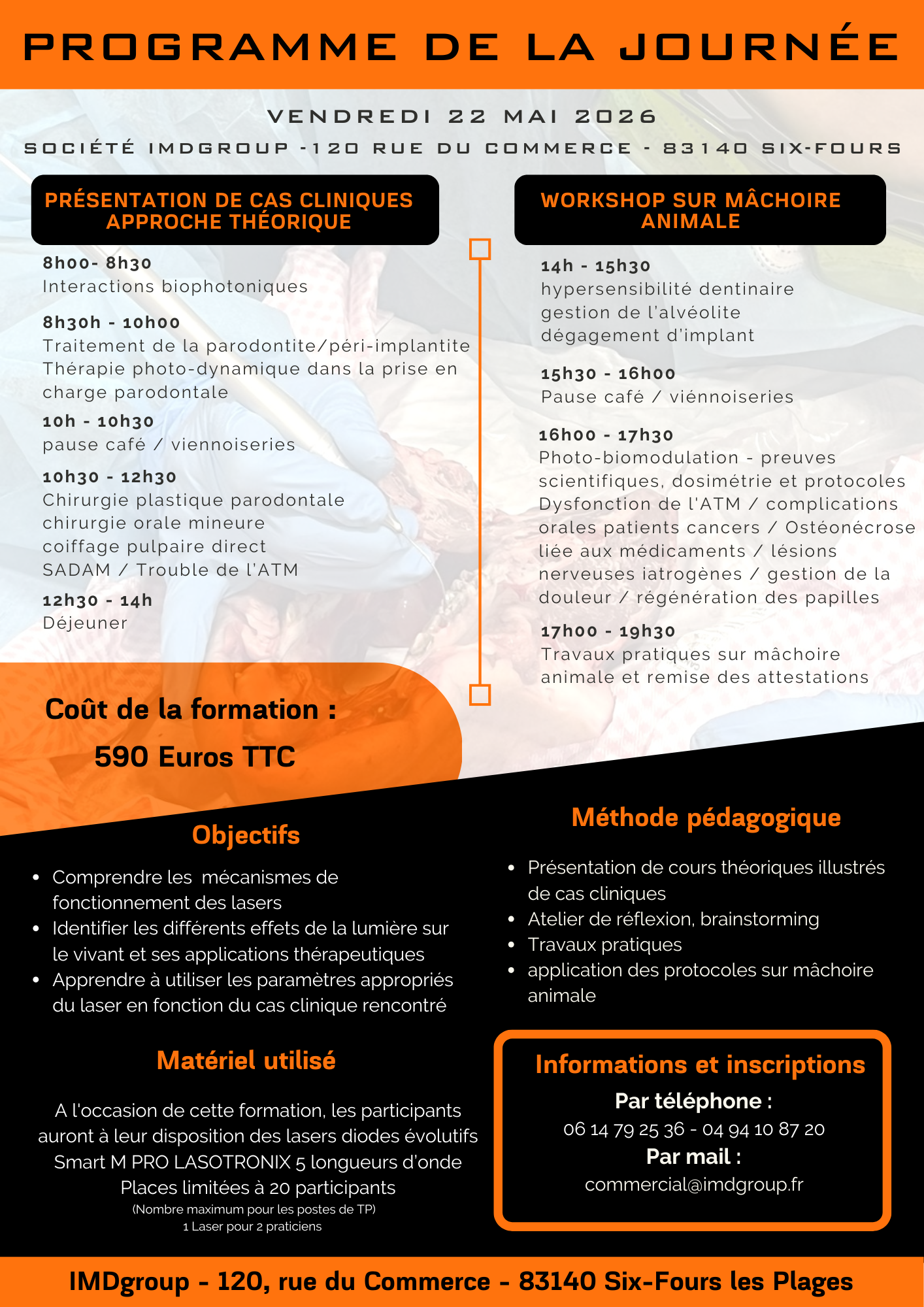 De nombreux cas cliniques seront présentés et les participants auront accès à nos lasers afin d’implémenter directement les protocoles sur mâchoire animale. A cette occasion, nous mettrons à disposition 1 laser pour 2 participants afin d’optimiser votre pratique de ce matériel.